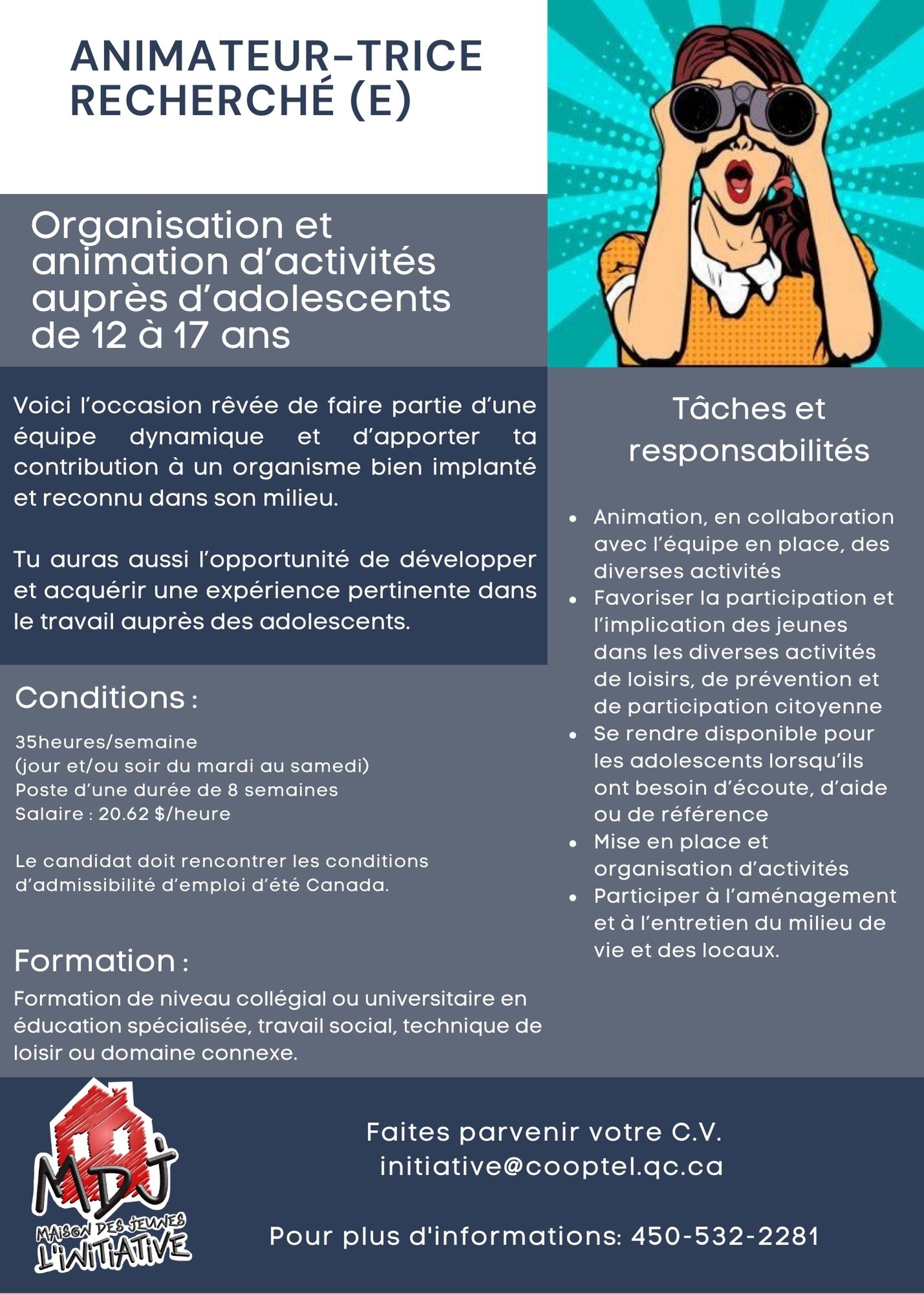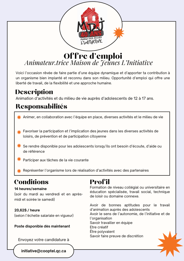 Pour toutes questions ou informations, vous pouvez vous adresser à l’organisme par téléphone au 450-532-2281 ou par courriel à initiative@cooptel.qc.ca.