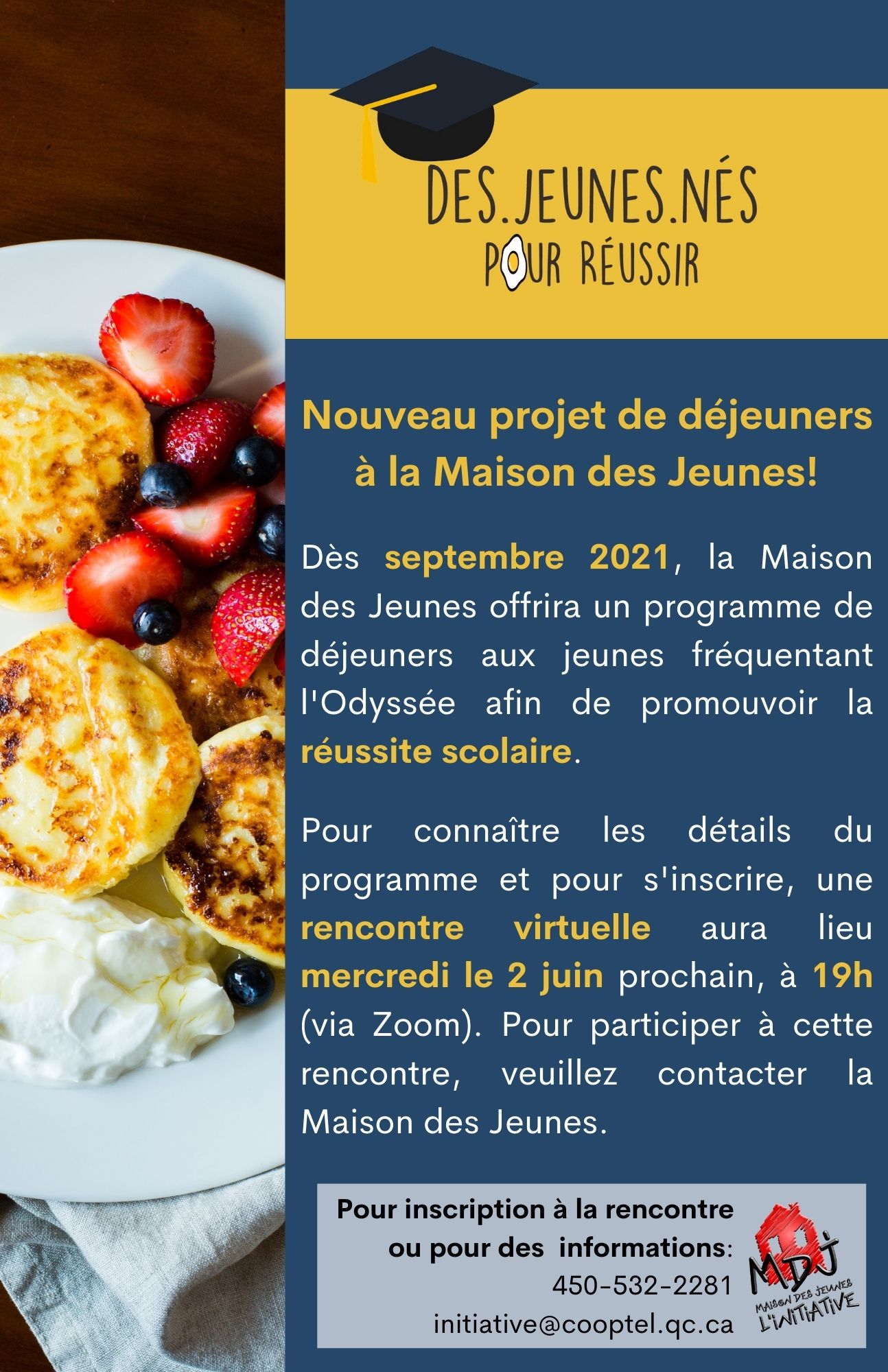 Un projet de déjeuners à la MDJ dès septembre prochain. Pour plus d’infos, nous organisons une rencontre virtuelle le 2 juin prochain !